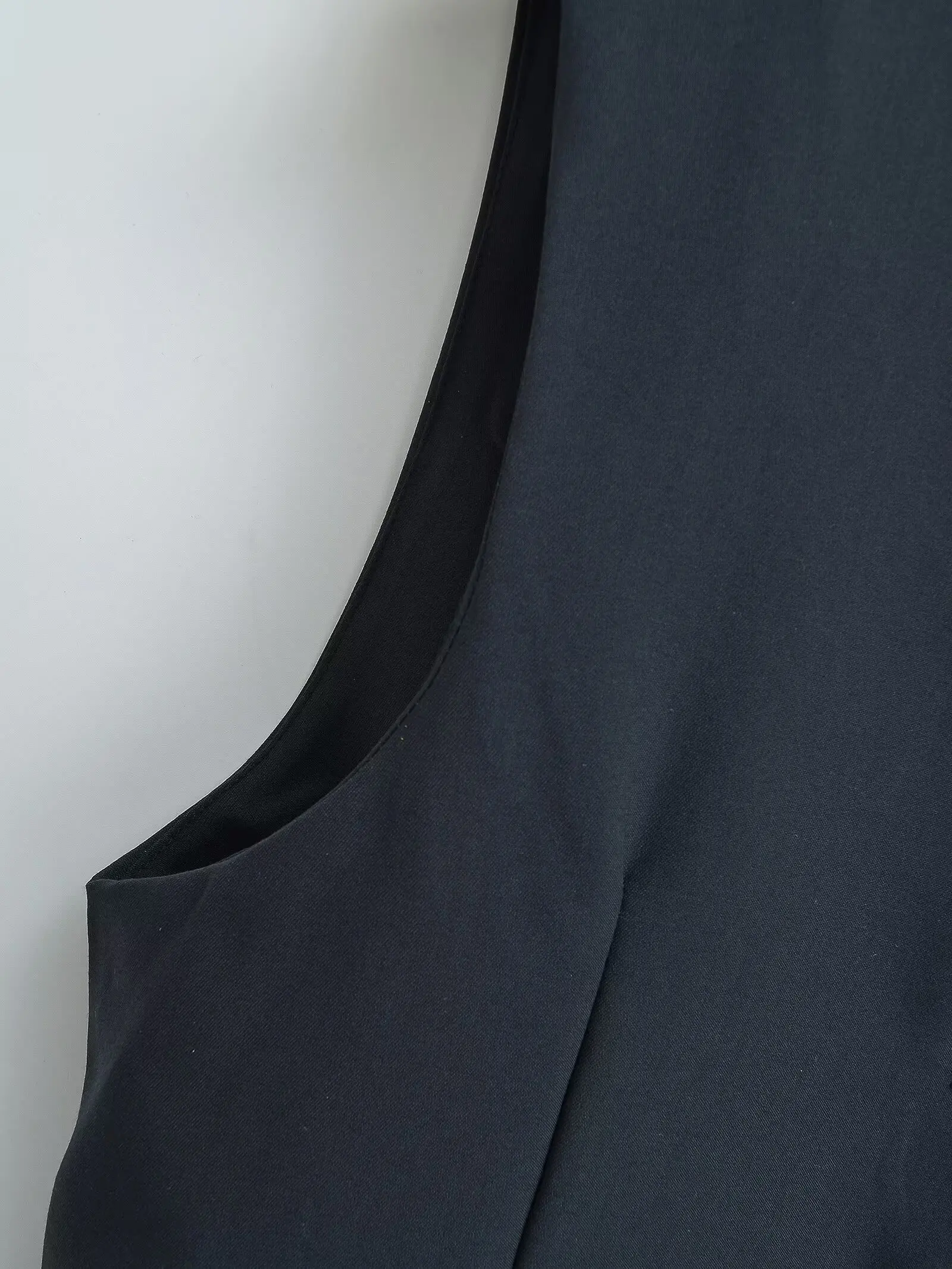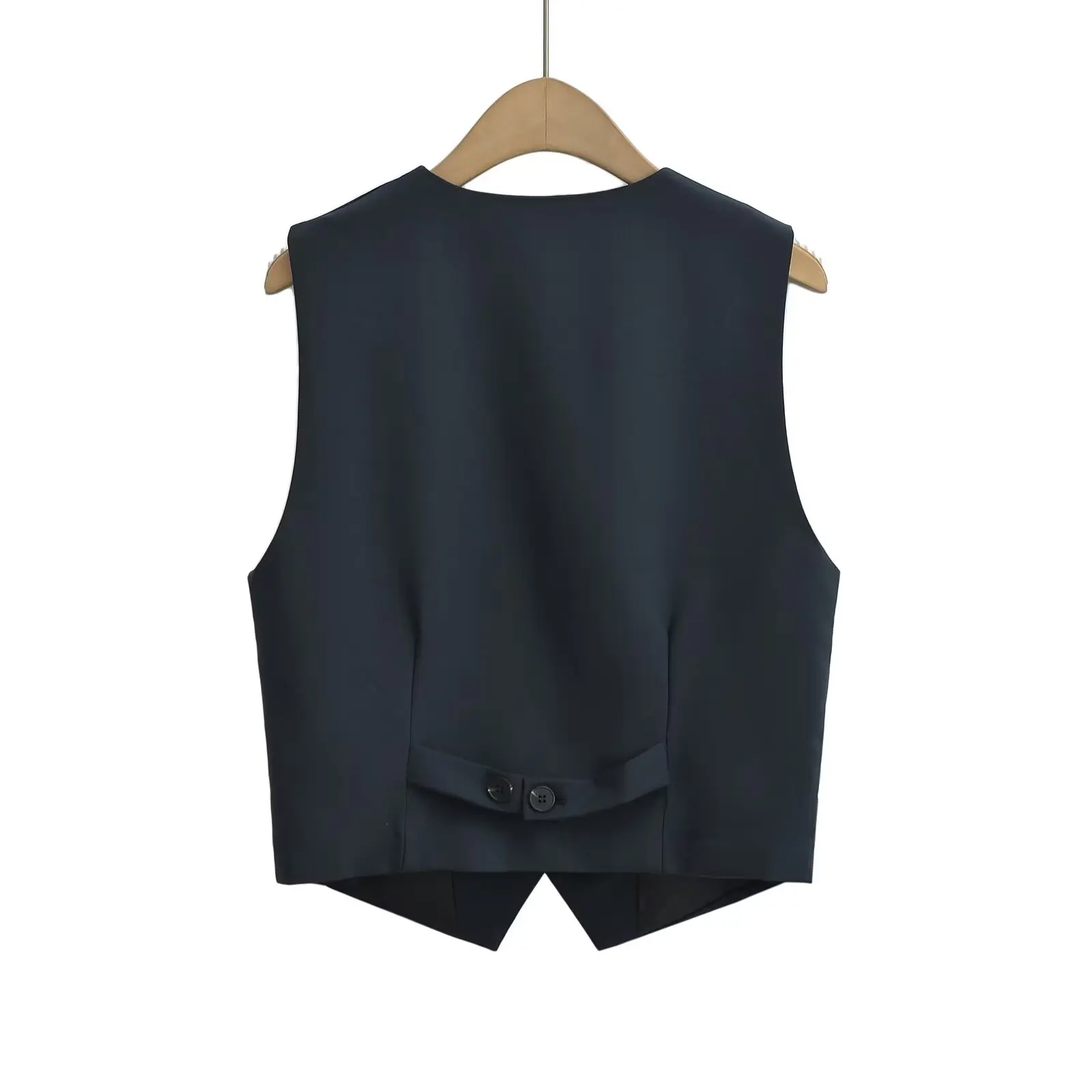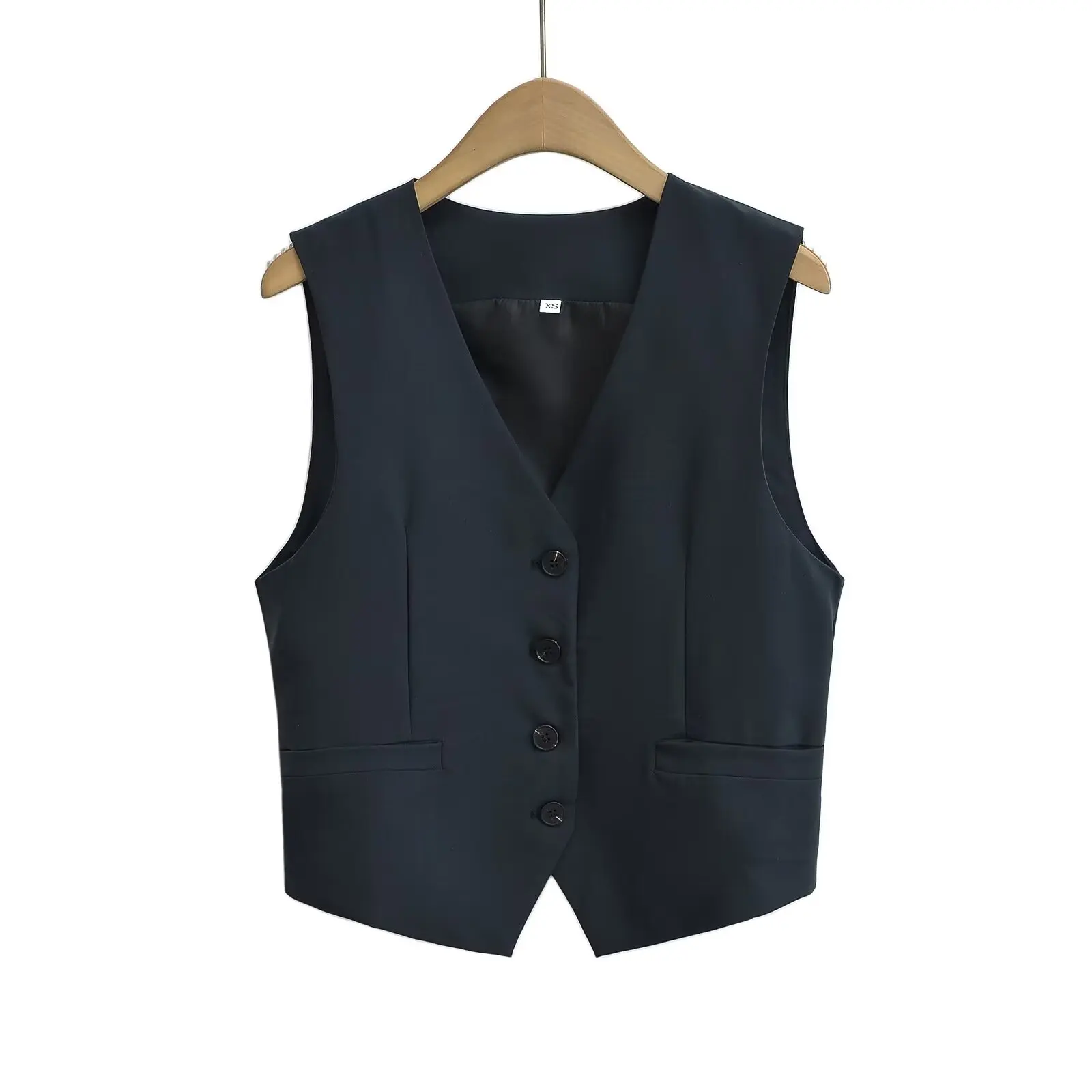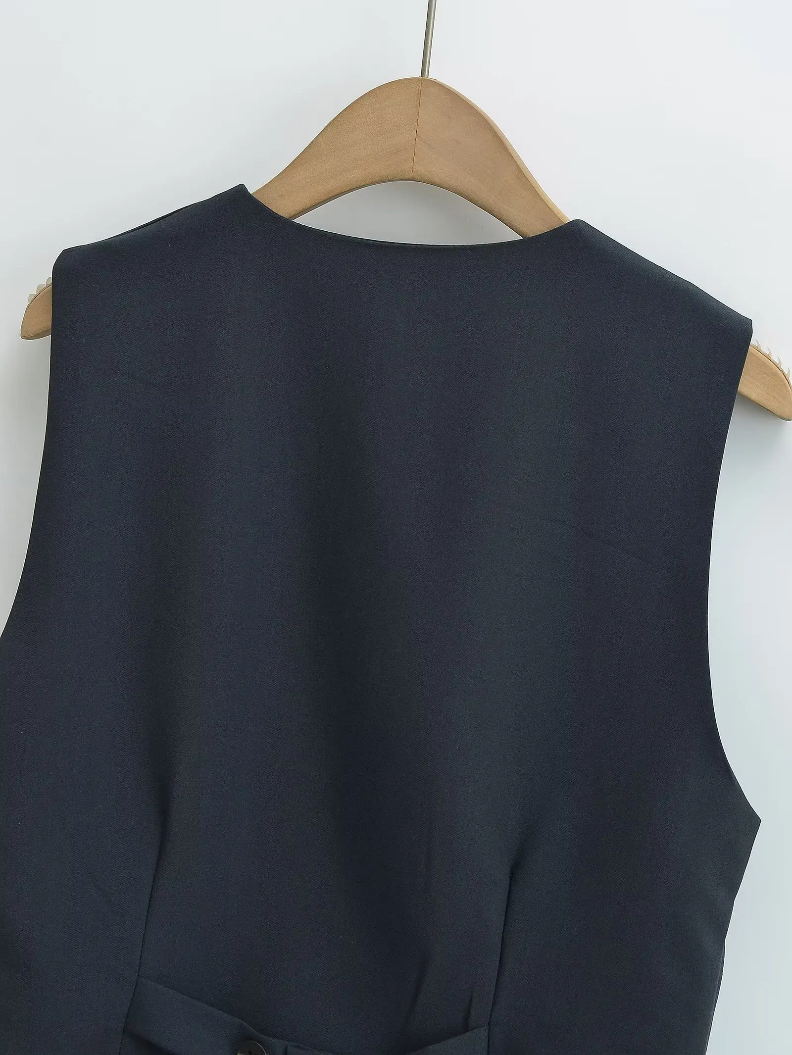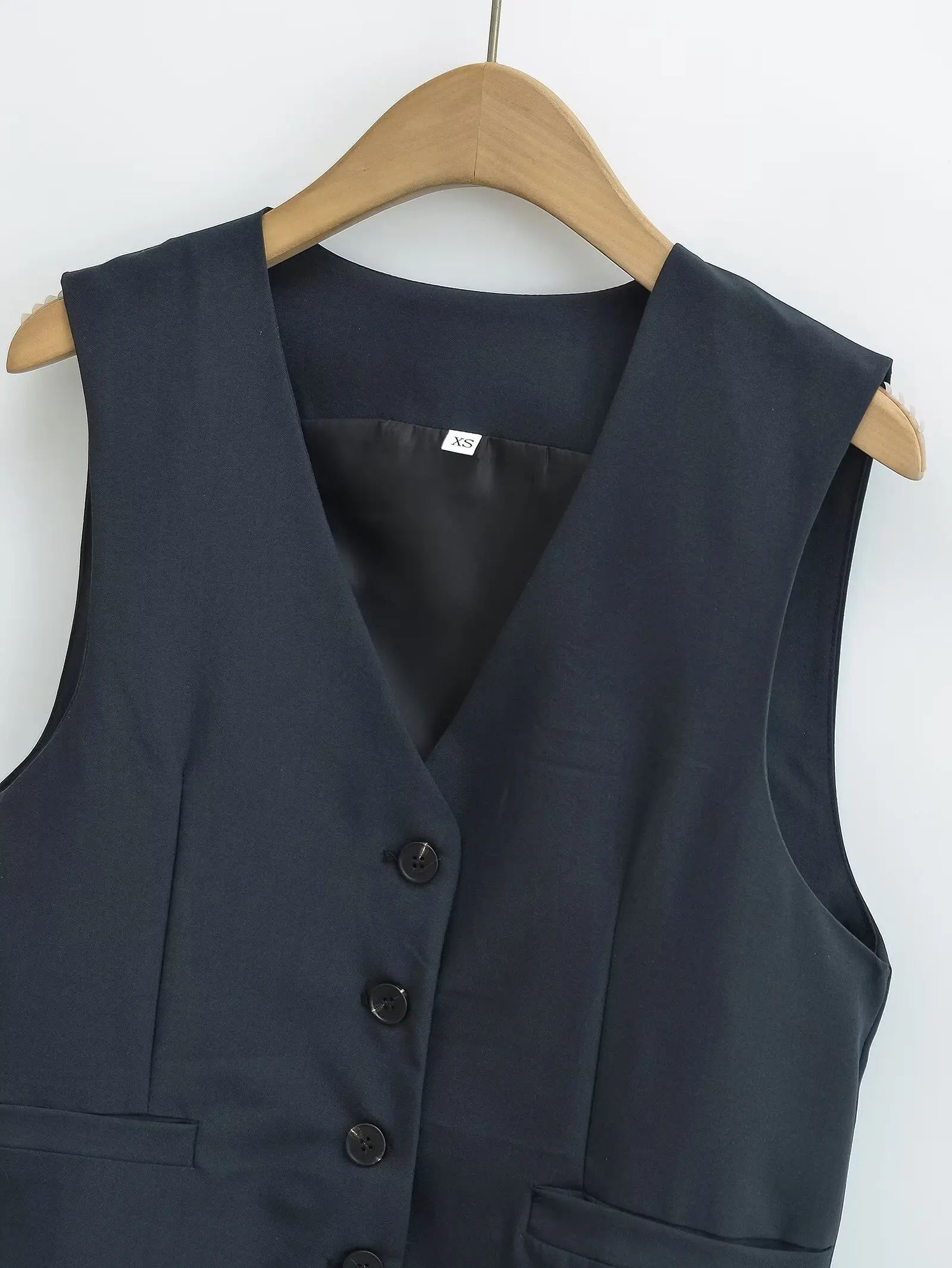 TRAFZA Casual Office Lady Blazer Women Solid V Neck Pockets Sleeveless Single Breasted Long Jacket Fashion 2024 Spring Coats
